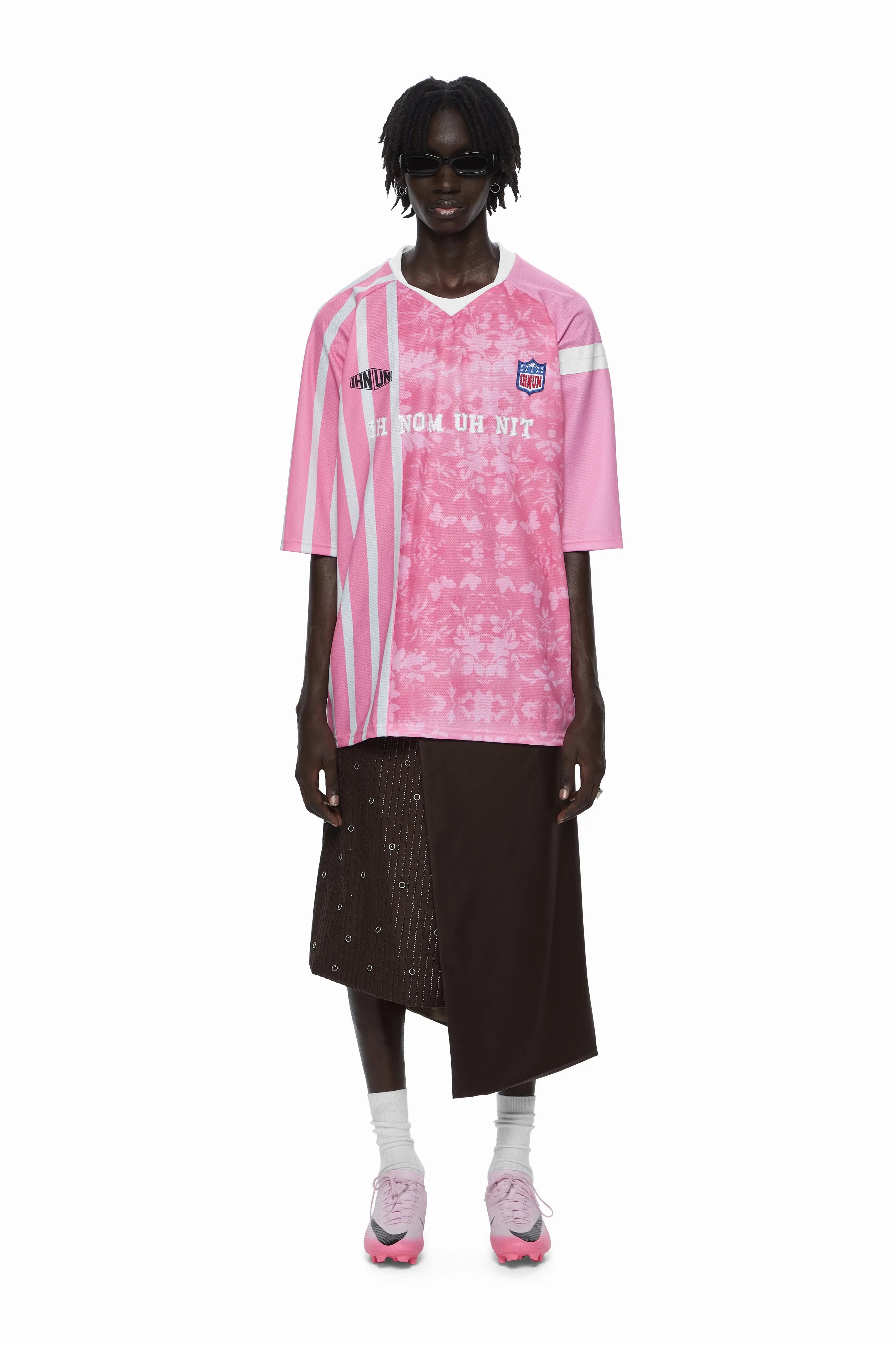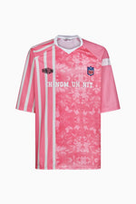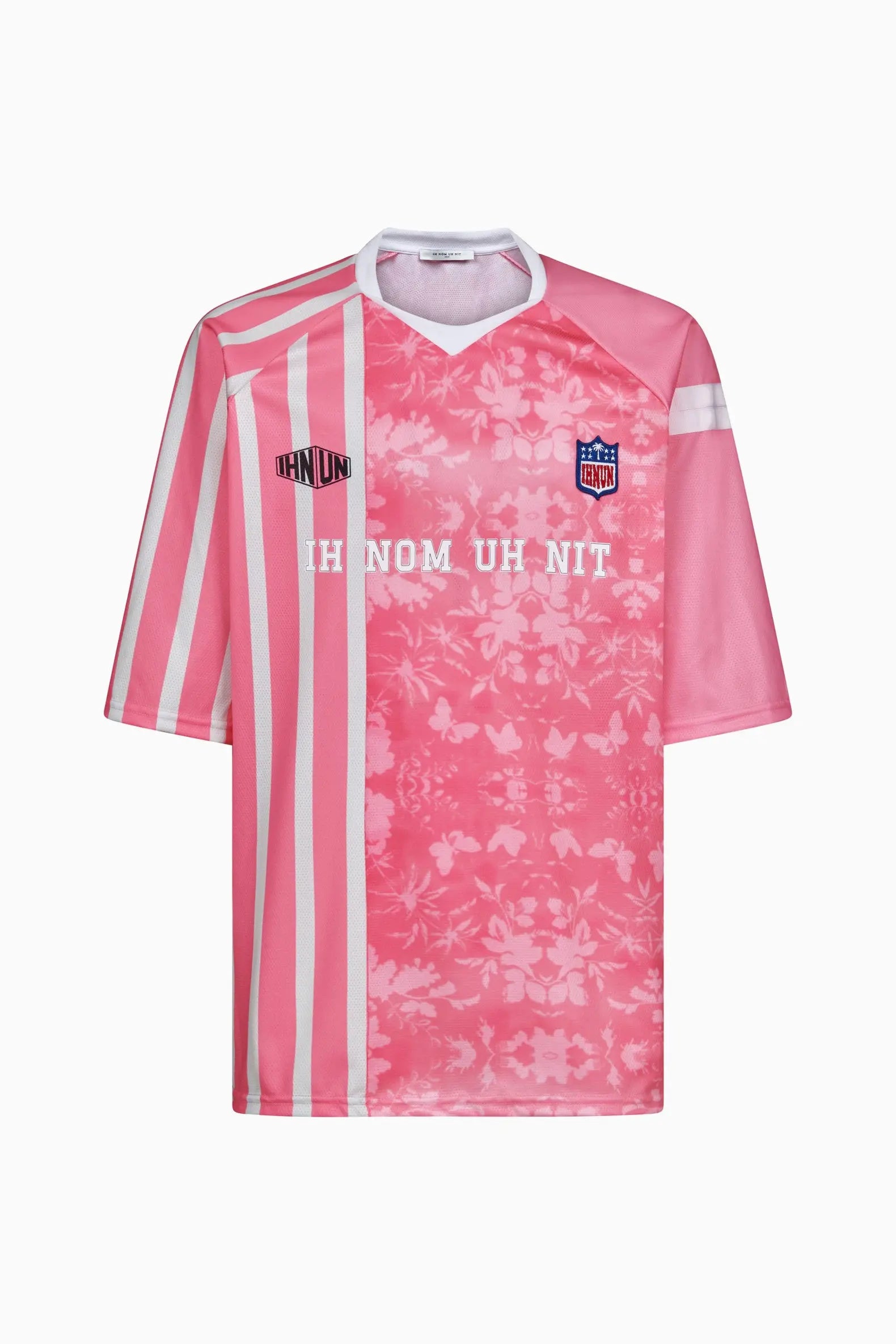 - Front: Vibrant pink base adorned with floral patterns and bold white stripes, featuring the "IH NOM UH NIT" logo and "IHN UN" shield emblem.