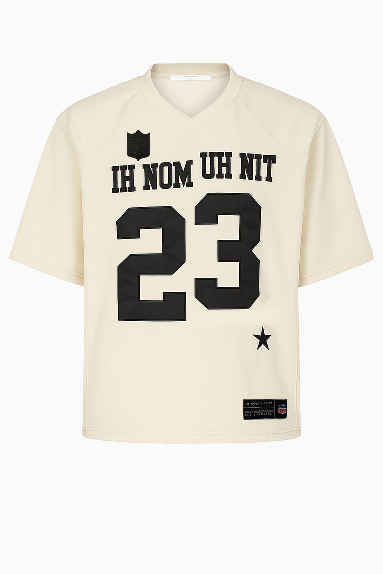 • Front: Glossy black tech jersey with tonal embroidered logo, “IH NOM UH NIT” lettering, and bold number 23 patch.