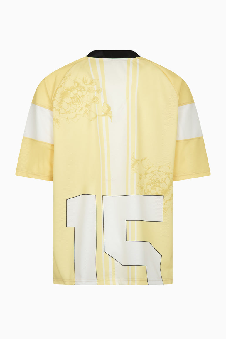 Front: Soft yellow tech jersey featuring a tonal floral artwork subtly integrated across the front. IH NOM UH NIT lettering and varsity number “15” enhance the luxury–sport identity, while contrast white sleeve panels add structure and depth.