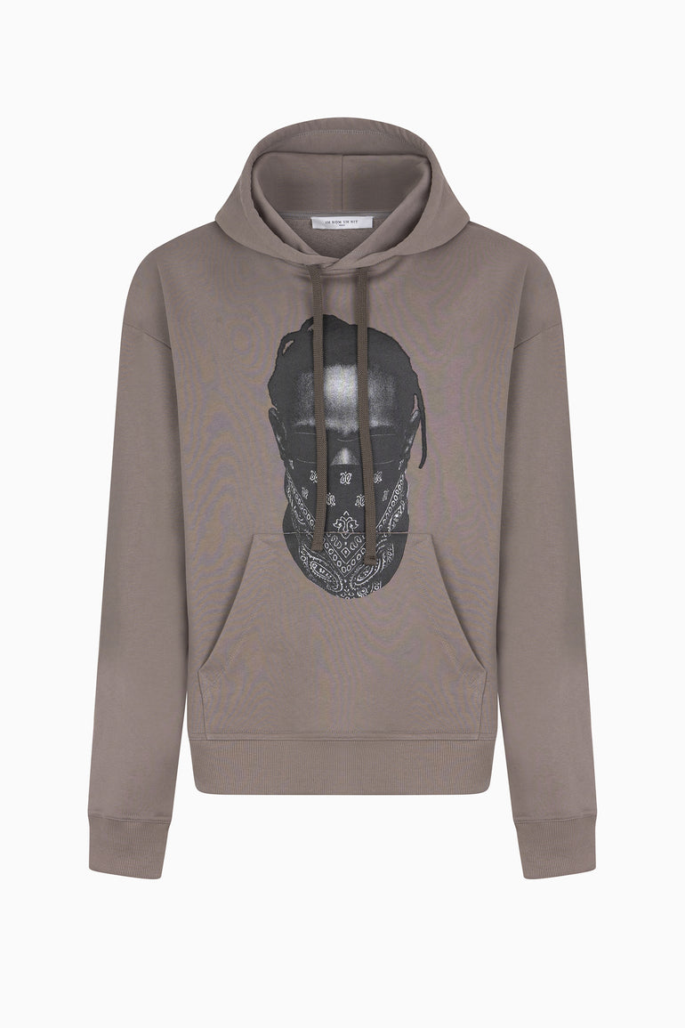 • Front: Bold monochrome graphic of a face with sunglasses and a paisley bandana mask