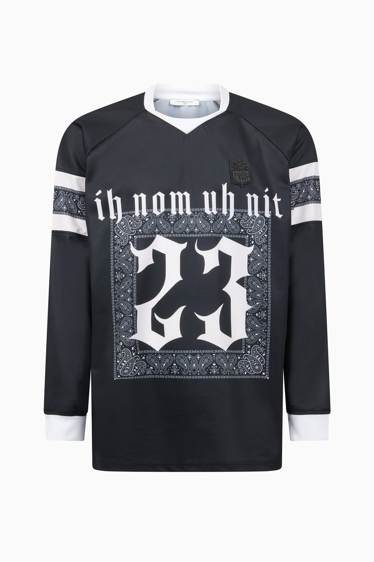 Front: Oversized “23” graphic framed with paisley bandana print, gothic “IH NOM UH NIT” lettering across the chest, and tonal crest patch at shoulder.