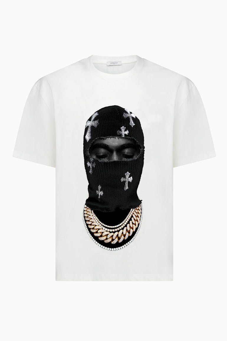 Front: Iconic Mask portrait featuring a black balaclava embellished with all-over cross motifs, paired with a bold chain necklace. A powerful graphic merging street iconography and spiritual symbolism.