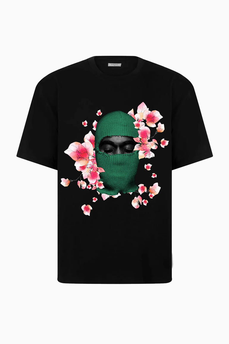 Front: Central graphic print featuring the iconic IH NOM UH NIT mask surrounded by delicate floral elements, creating a bold contrast between strength and fragility.