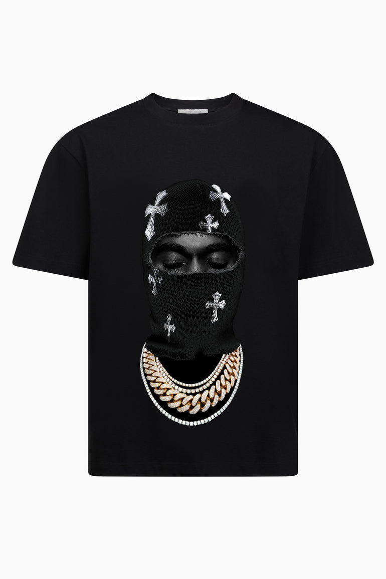 • Front: Iconic Mask portrait featuring a black balaclava embellished with all-over cross motifs, paired with a bold chain necklace. A powerful graphic merging street iconography and spiritual symbolism.