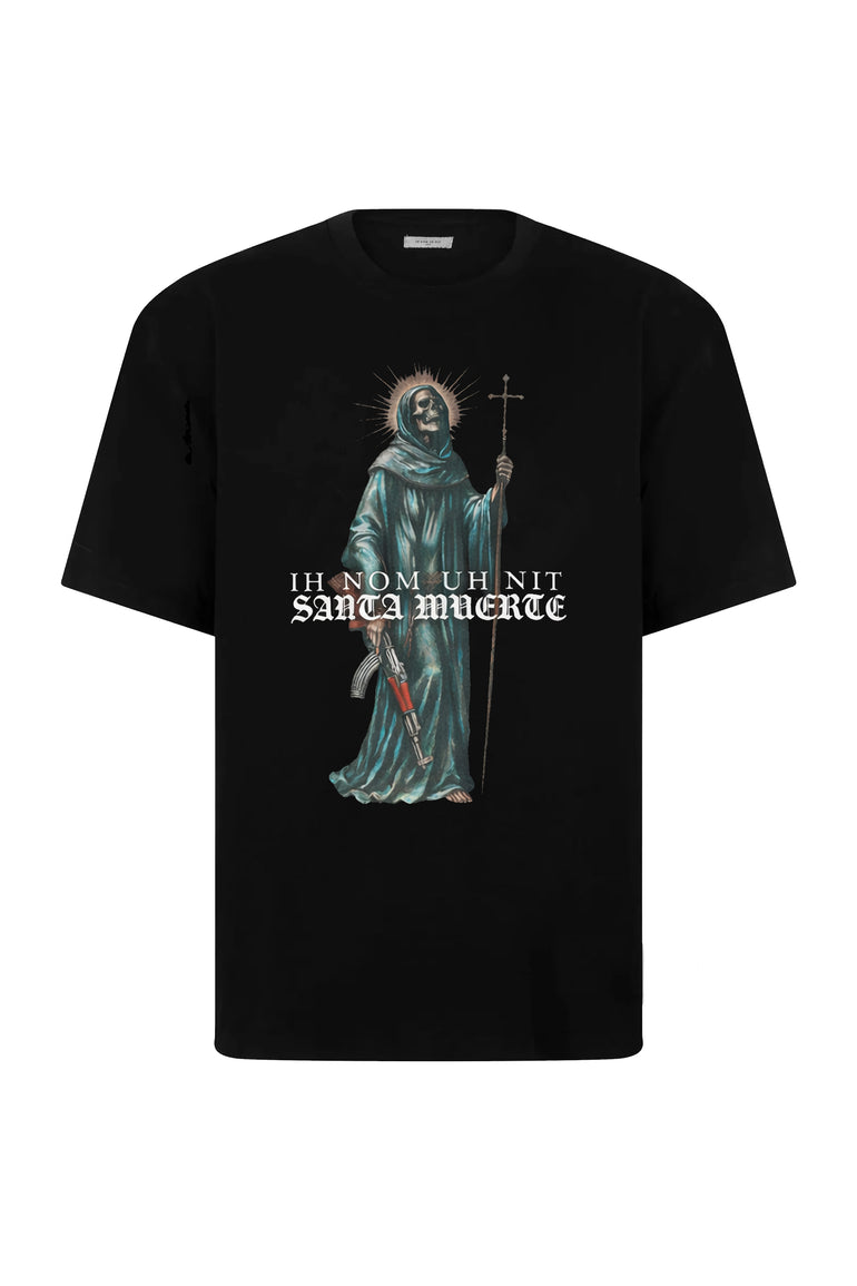• Front: Striking Santa Muerte illustration featuring a skeletal figure with halo, holding a cross and an assault rifle. The IH NOM UH NIT Santa Muerte lettering reinforces the brand’s signature blend of sacred iconography and raw street culture.