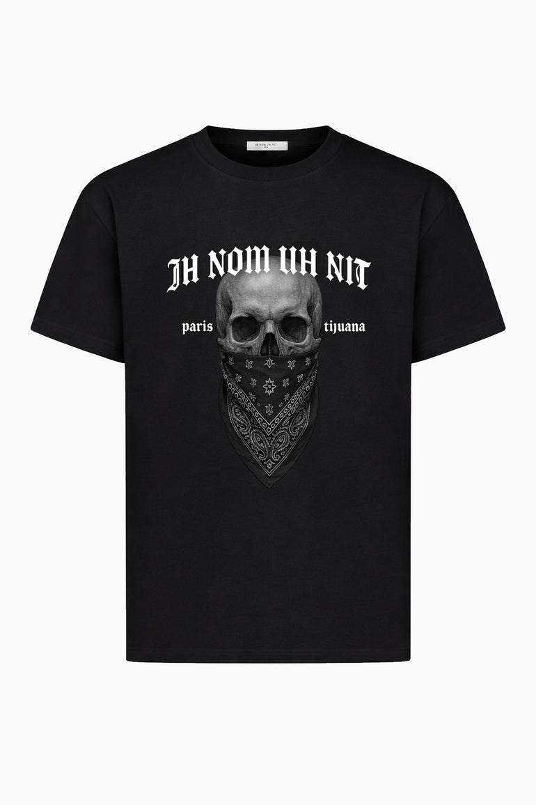 Front: Bold skull graphic with bandana mask printed at the center, framed by IH NOM UH NIT lettering with “Paris” and “Tijuana” references. A raw, street-inspired visual with strong identity.