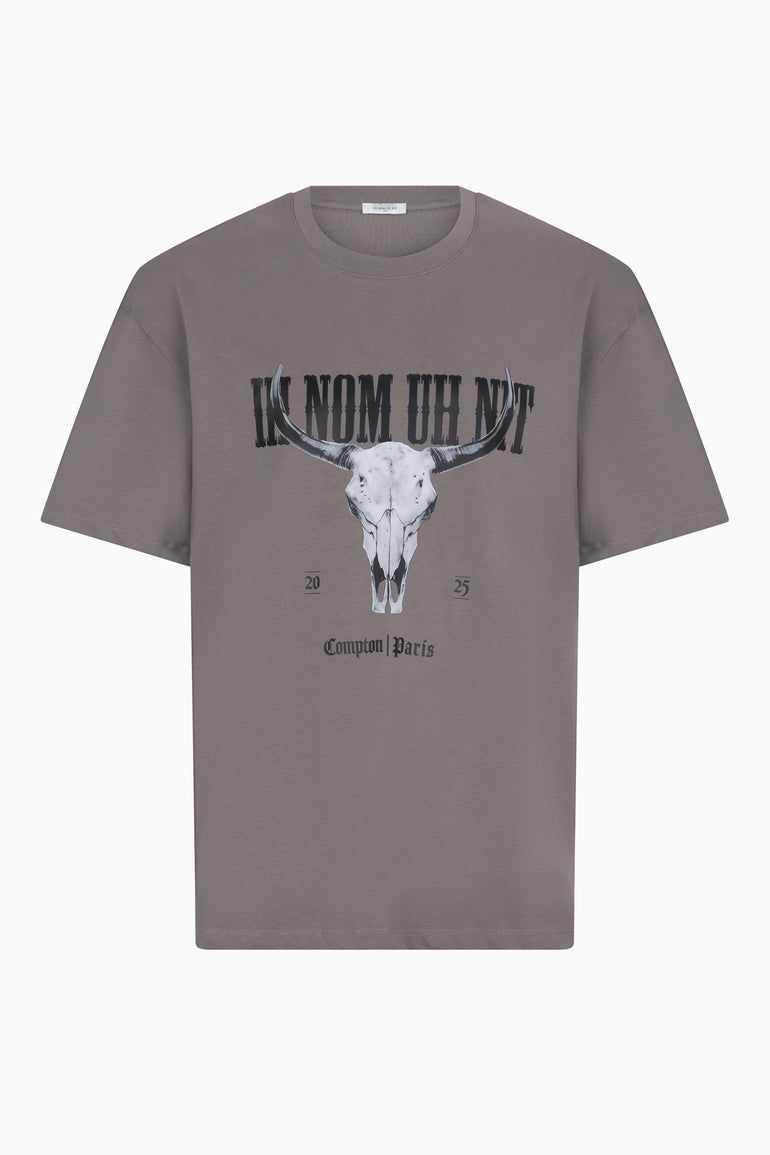 Front: White cotton jersey T-shirt featuring bold “IH NOM UH NIT” lettering and large skull with horns graphic at the center, completed with “Compton | Paris” detail and seasonal year print